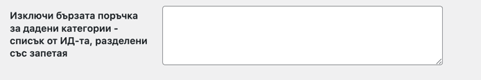 Версия 1.04 – Изключване на категории. От тази версия администраторът на магазина може да задава на в продукти от кои категории плъгинът да не се извежда. Въвеждането на категории е по „ID“ на съответната категория, отделени със запетая, пример: „1,2,3“. В този пример бутонът няма да се извежда на категории с „ID“ -> „1,2,3“.