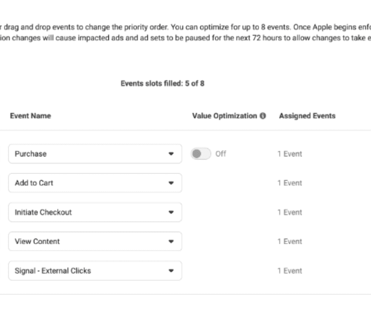 Фейсбук ще направят конфигурация на конверсионните събития, които са най-ценни и релевантни за бизнеса ви, базирани на данни спрямо активността и действията на потребителите. Всички останали ивенти няма да бъдат активни за целите на репортинга/отчетността и кампанийната оптимизация.